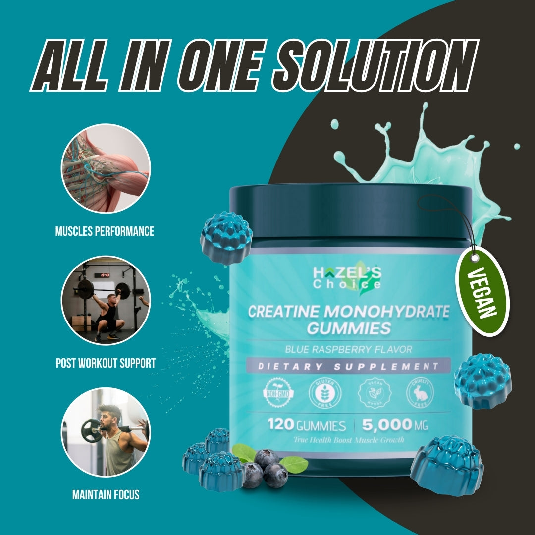 HAZEL'S Choice Creatine Monohydrate Gummies โ 5000mg, 120 Count โ Vegan, Gluten-Free, Blue Raspberry & Strawberry Flavor โ Dietary Supplement